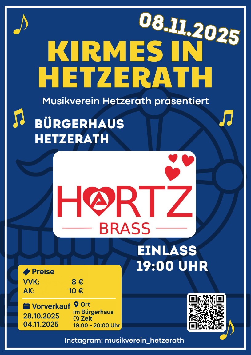Der Musikverein Hetzerath lädt herzlich zur traditionellen Kirmes am Samstag 08. Nov. 2025, ab 19:00 Uhr in die Bürgerhalle Hetzerath ein.